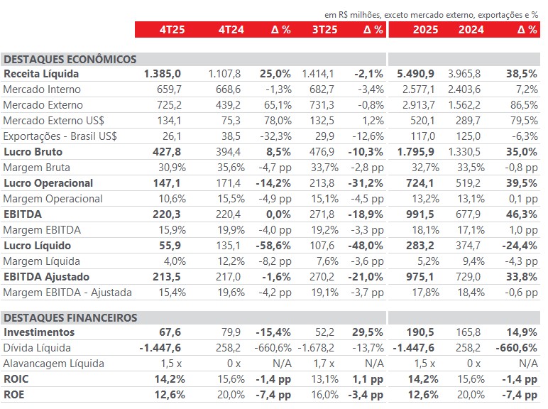 O EBITDA ajustado atingiu R$ 975,1 milhões, alta de 33,8% na comparação com 2024, enquanto a margem EBITDA ajustada ficou em 17,8%. As receitas internacionais, que somam os valores registrados nas operações em outros países com as exportações de produtos a partir do Brasil, cresceram 79,5% com relação ao ano anterior, totalizando US$ 520,1 milhões.